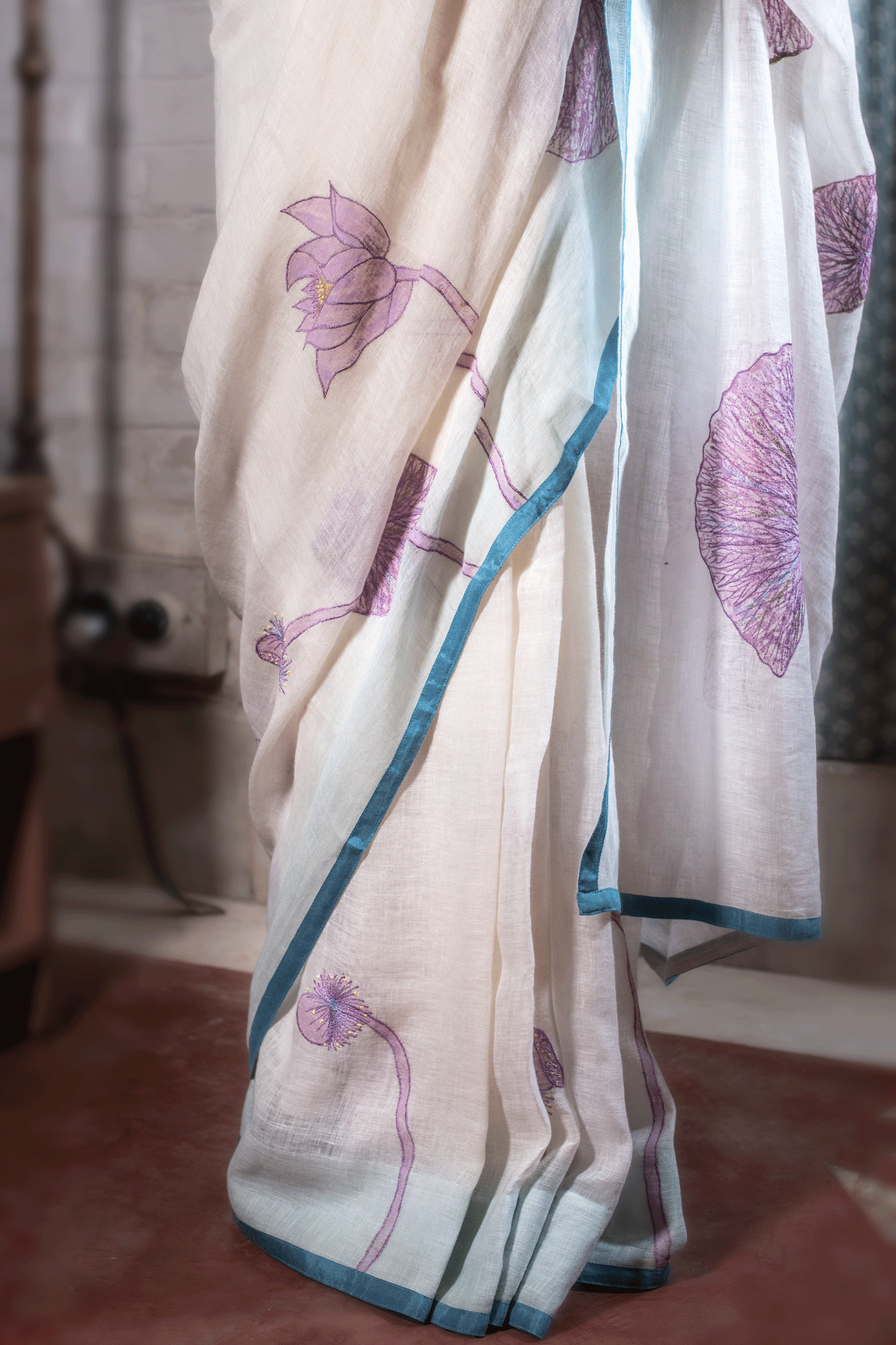 This saree represents the still waters, the Hand painted, embroidered lavender pink lotuses and the delicate water drops. It is an Ode to Jamini, the woman who bloomed in still waters of life with sprinkling of few waterdrops of love-past and present, creating beauty of life.