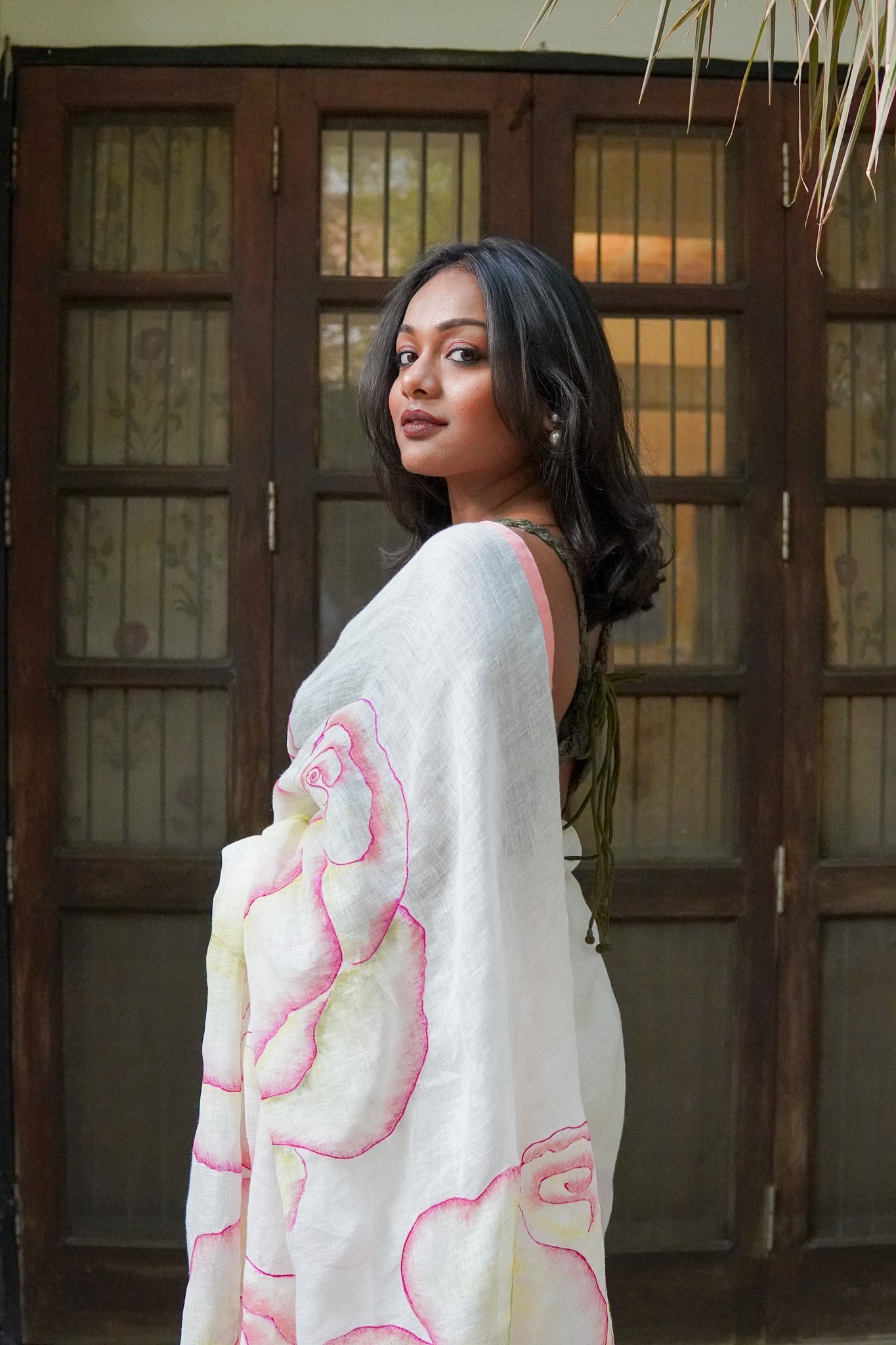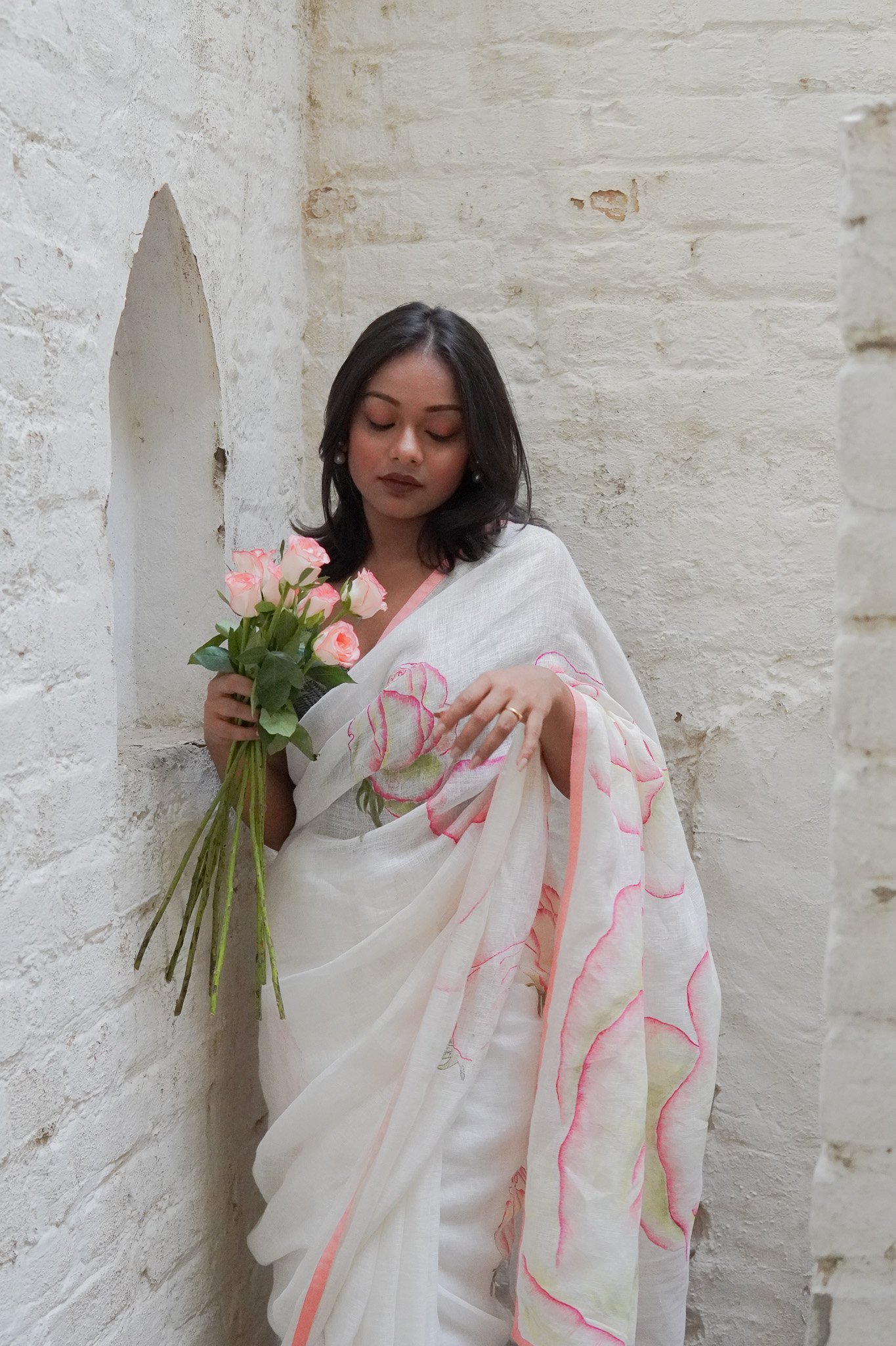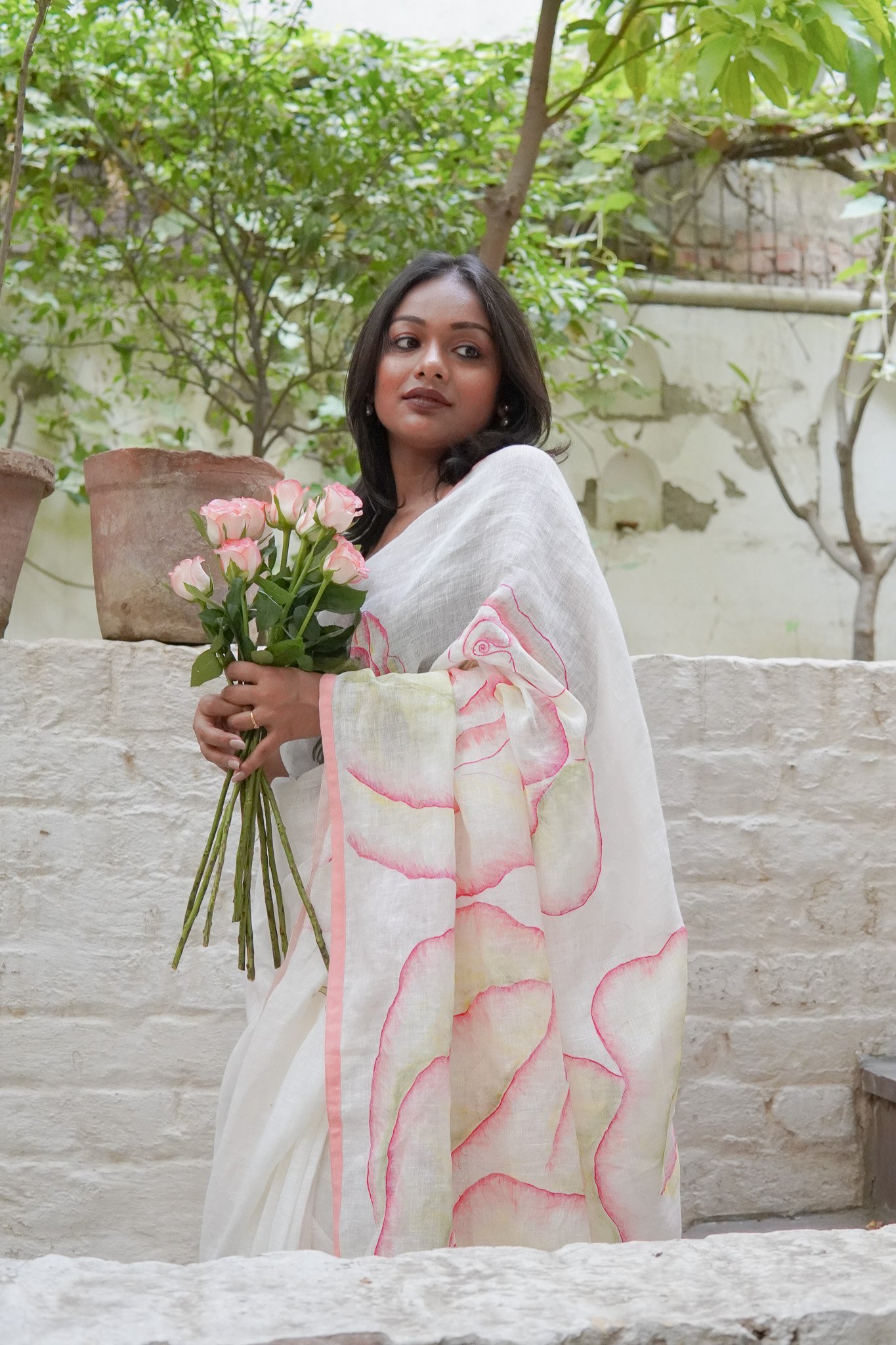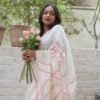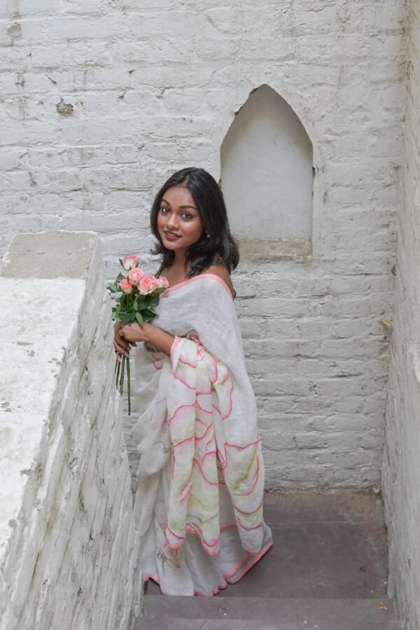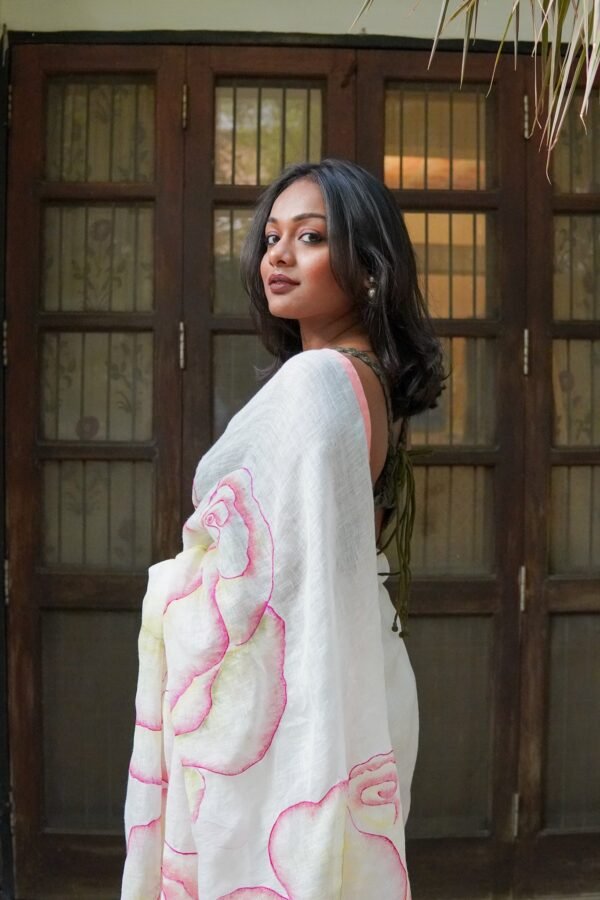 A rose needs nothing to be written about it. Come, experience the roses through this beautiful linen saree which has made eternal a small fragrant rose from a rose bush in our garden.