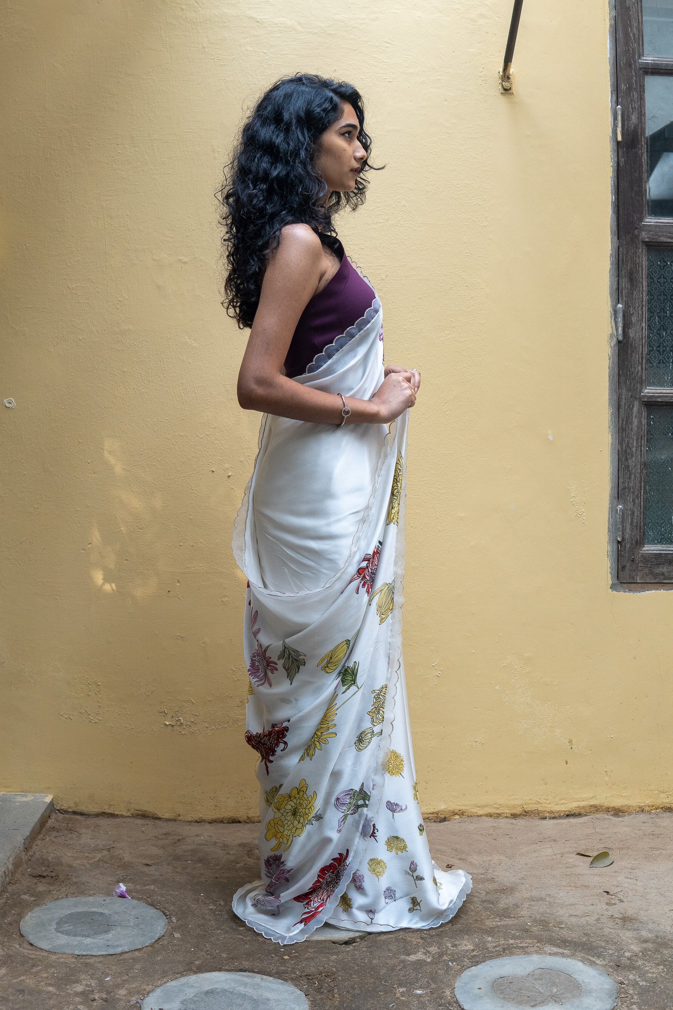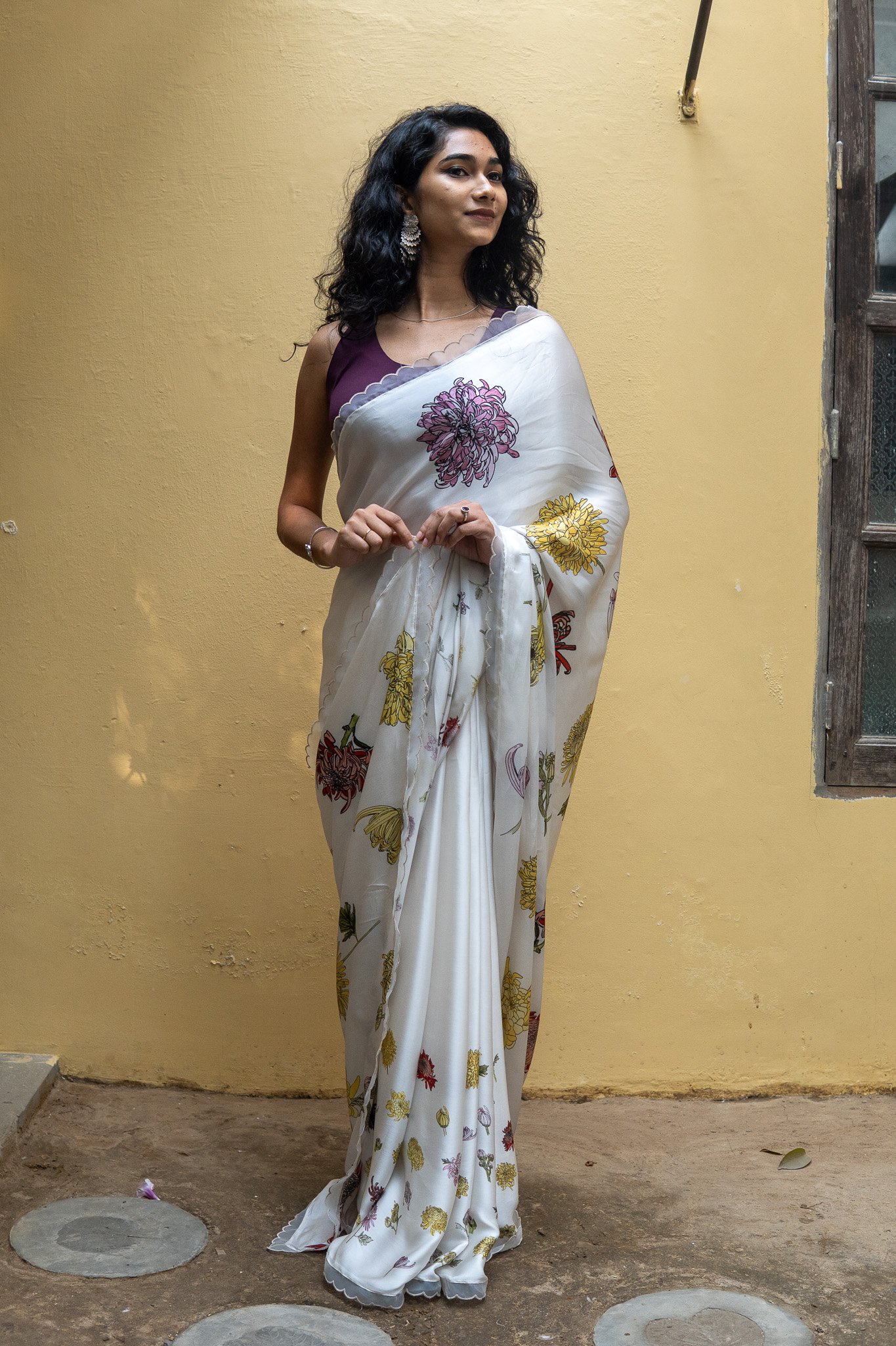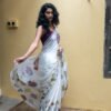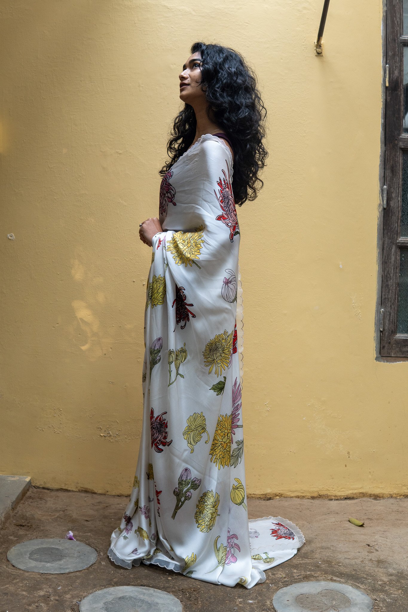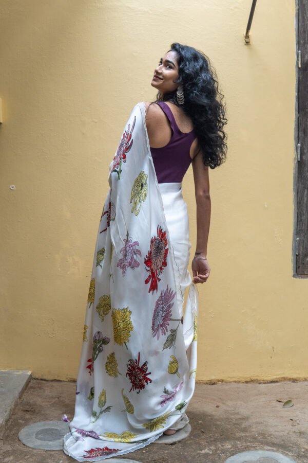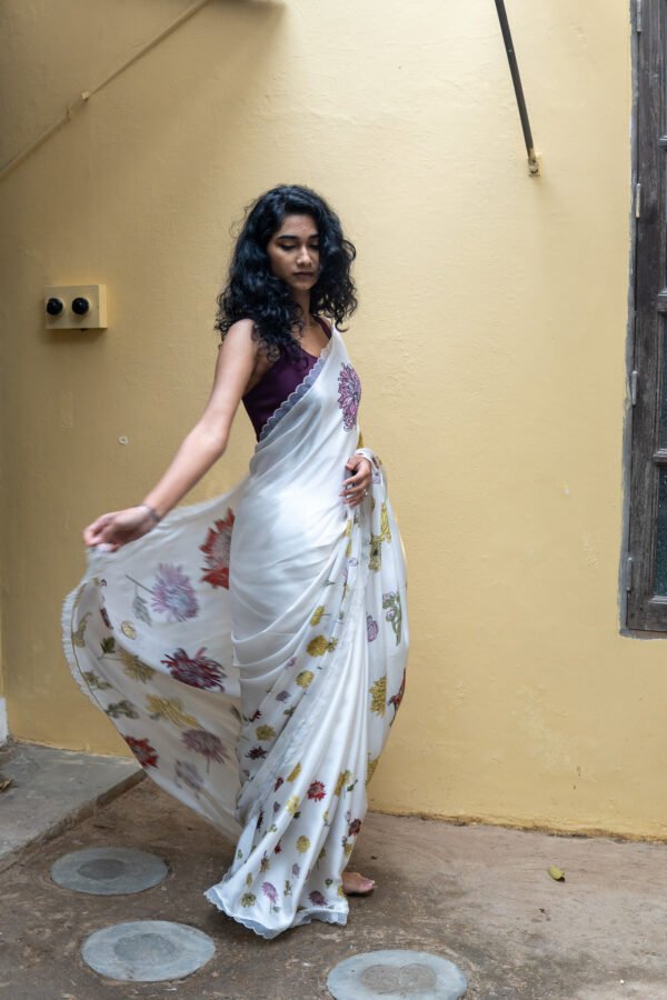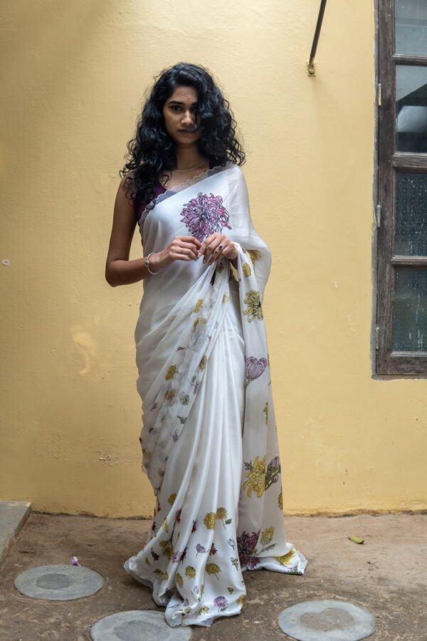 Beautiful delicate Chrysanthemum dance on this saree with each step like theĀ blooms dancing in breeze in fields of Chrysanthemum. A drape that blooms joyously !