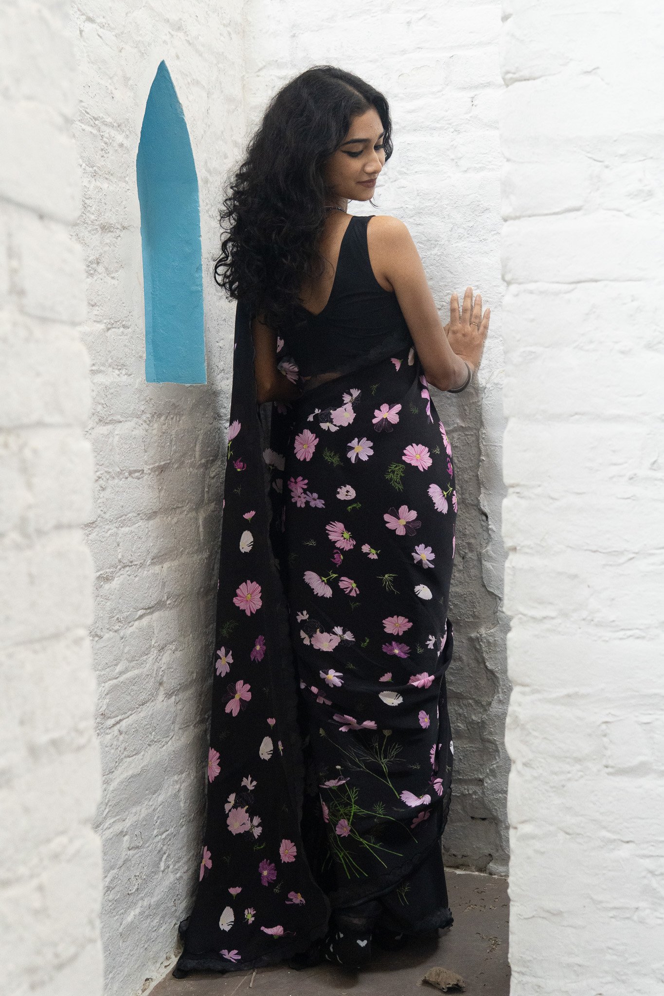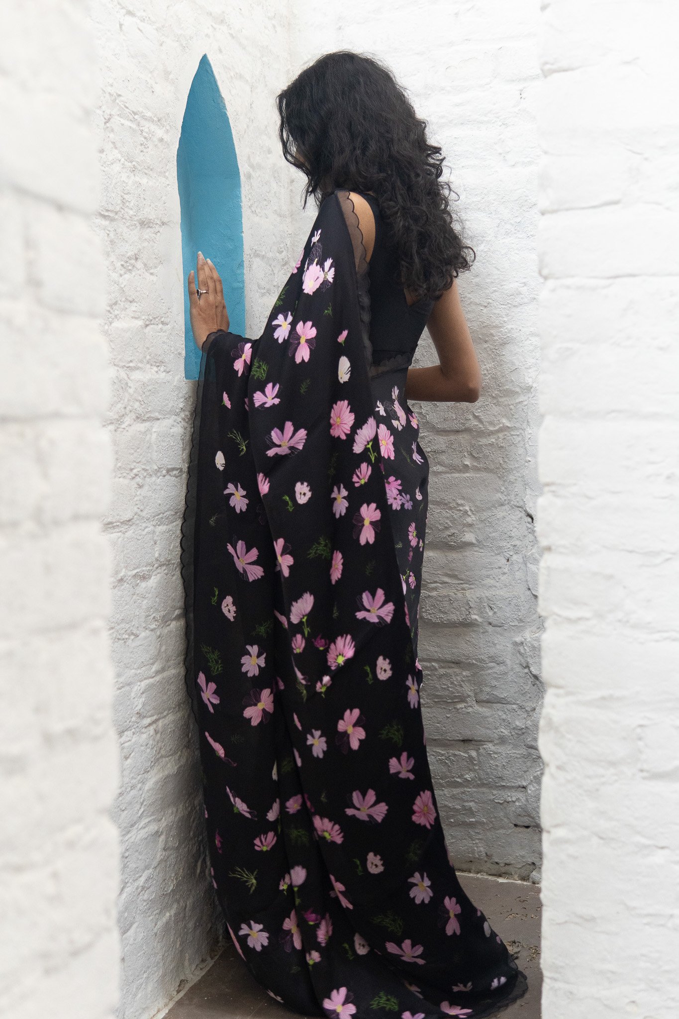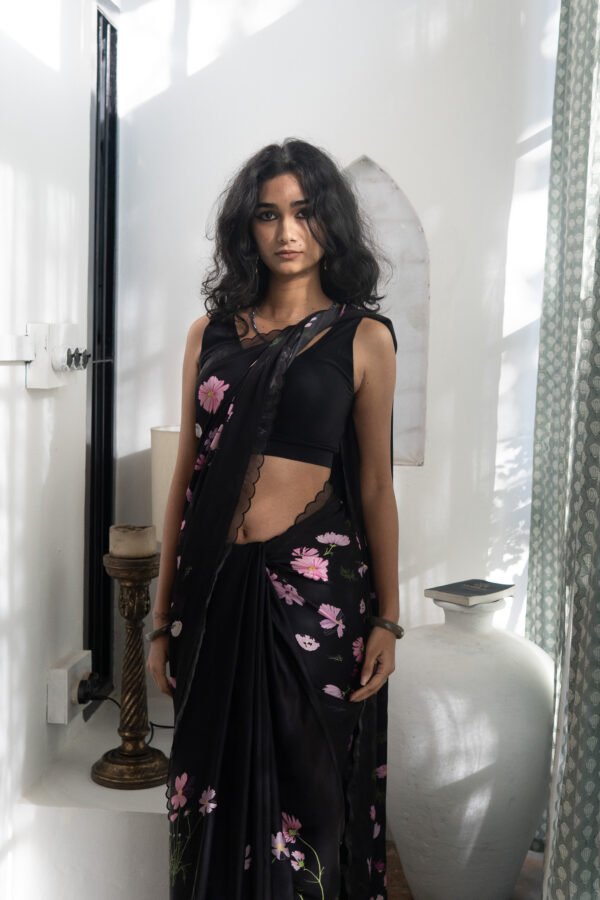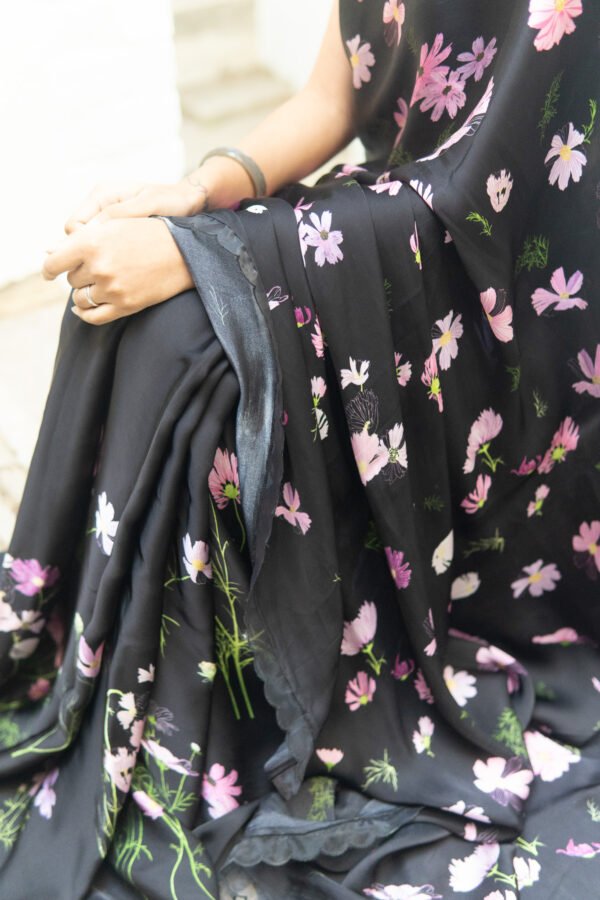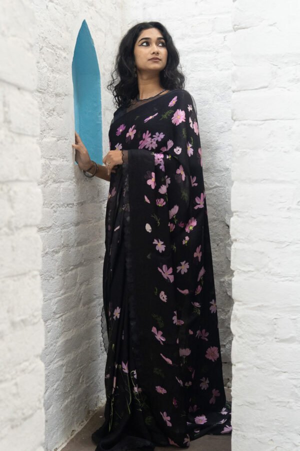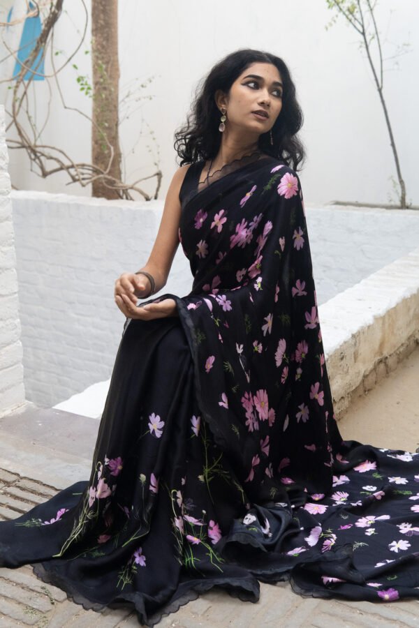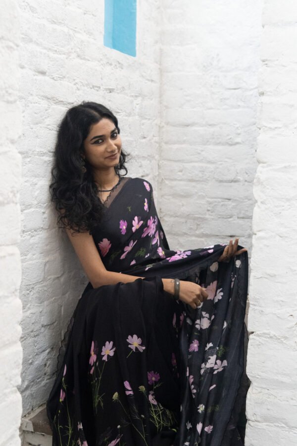 Cosmos flowers trail across the saree like strokes of nature’s art—simple, serene, and beautifully poetic. A drape that feels like a trail of calm, airy blooms & gentle breeze in full blossom.