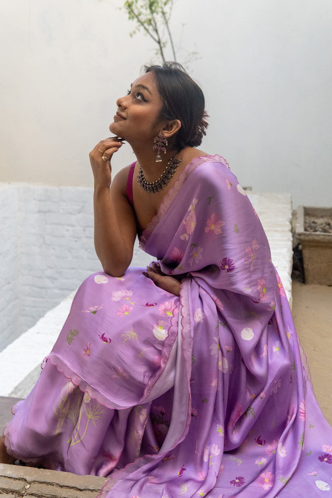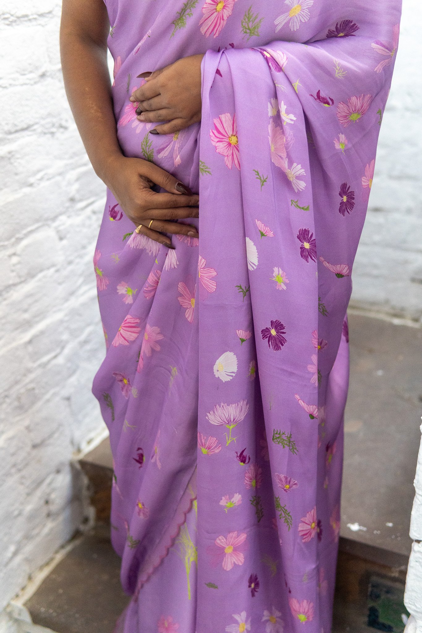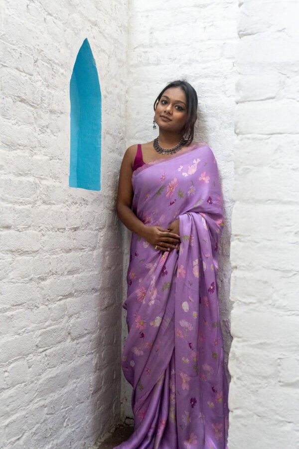 Cosmos flowers trail across the saree like strokes of nature’s art—simple, serene, and beautifully poetic. A drape that feels like a trail of calm, airy blooms & gentle breeze in full blossom.