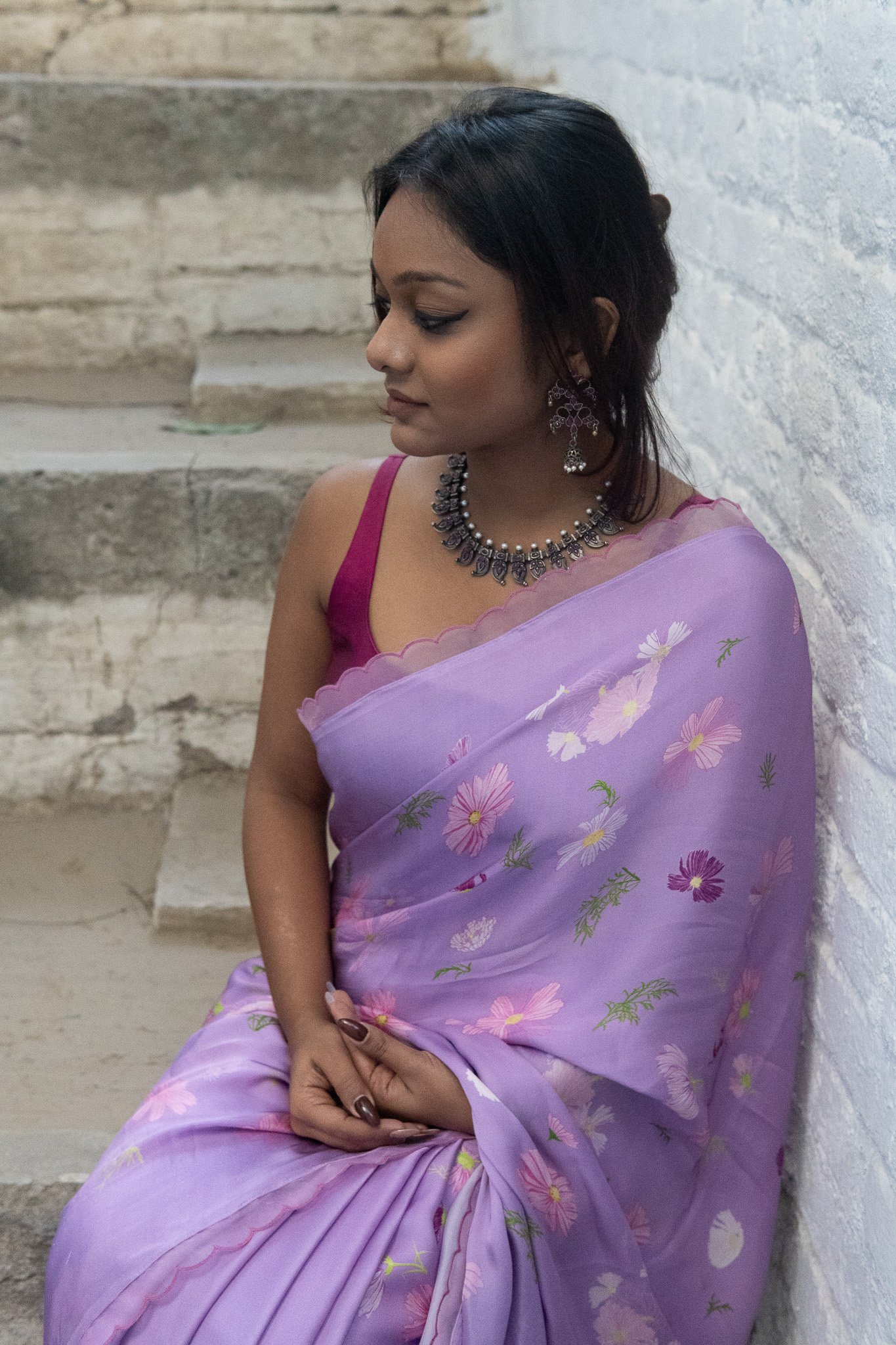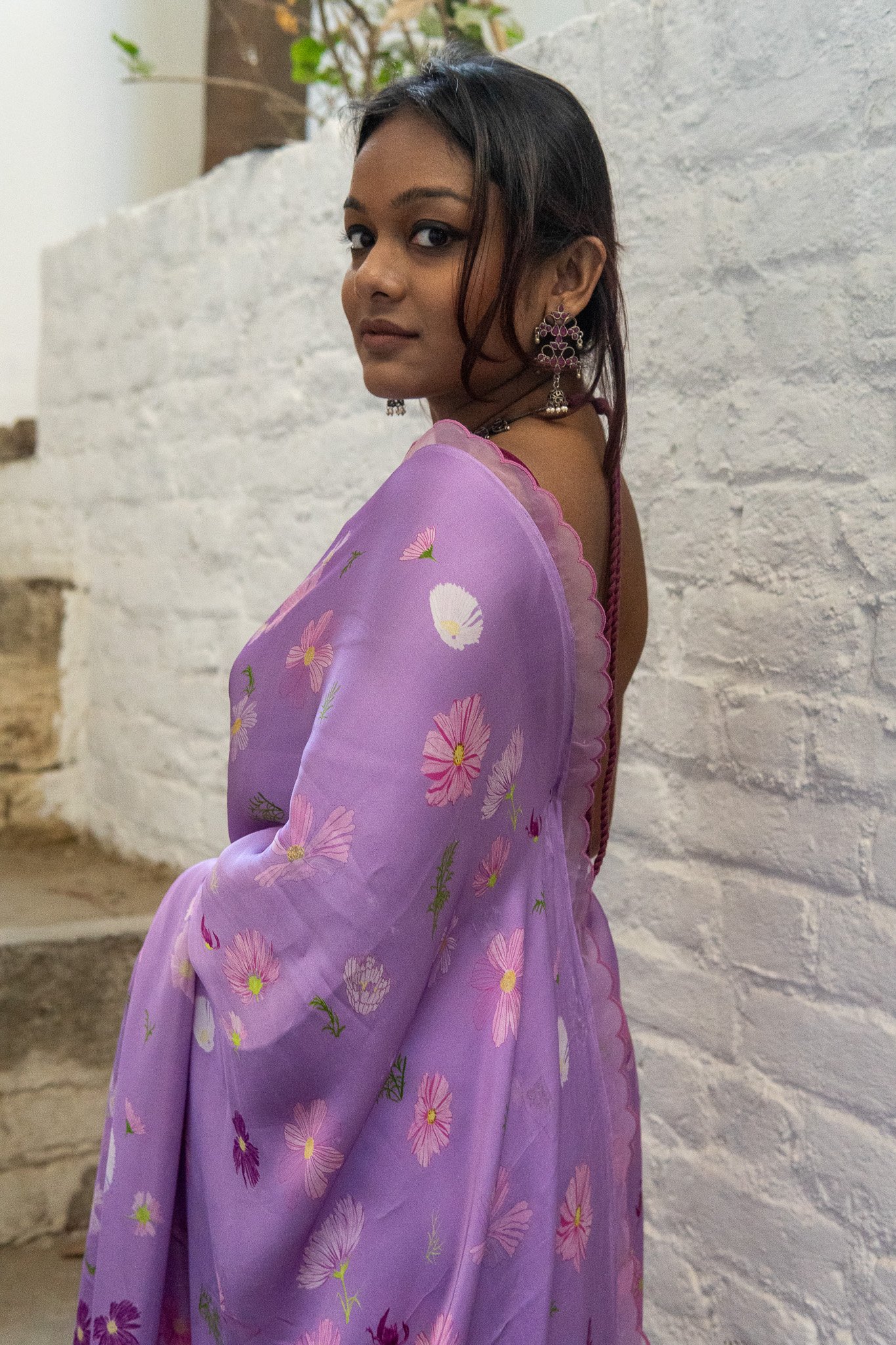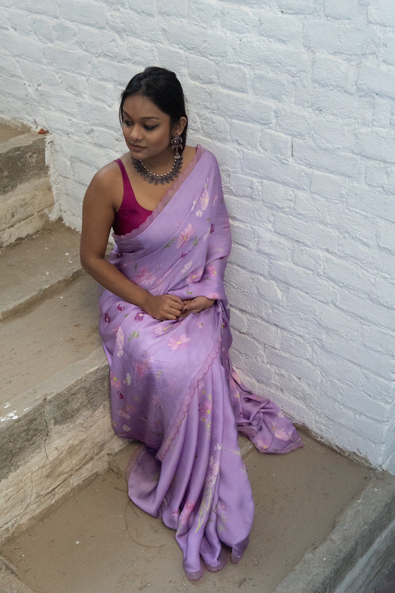 Cosmos flowers trail across the saree like strokes of nature’s art—simple, serene, and beautifully poetic. A drape that feels like a trail of calm, airy blooms & gentle breeze in full blossom.