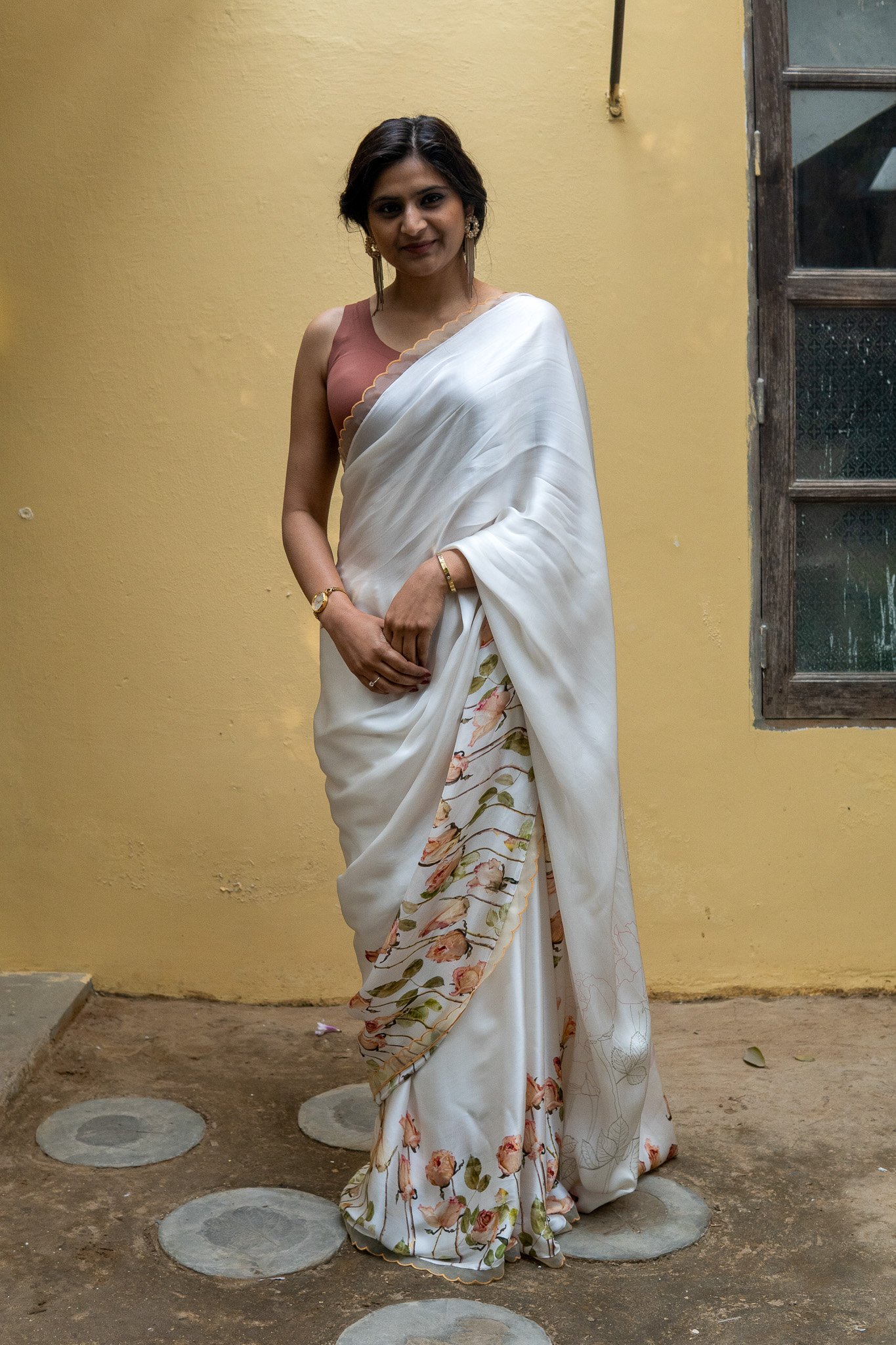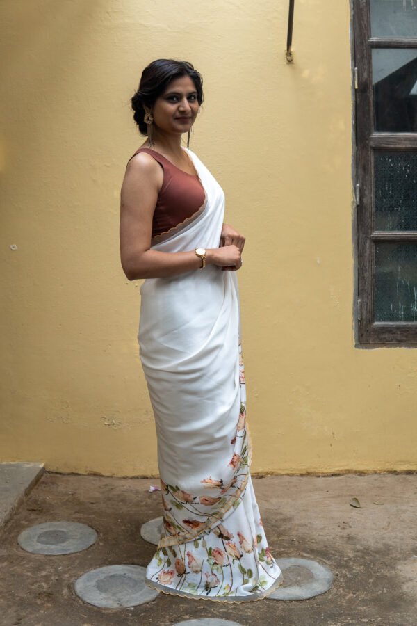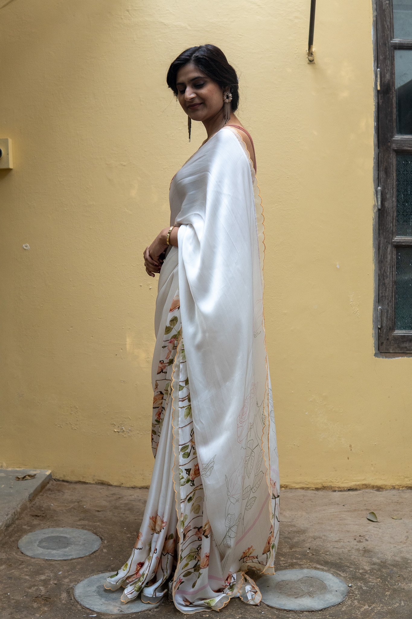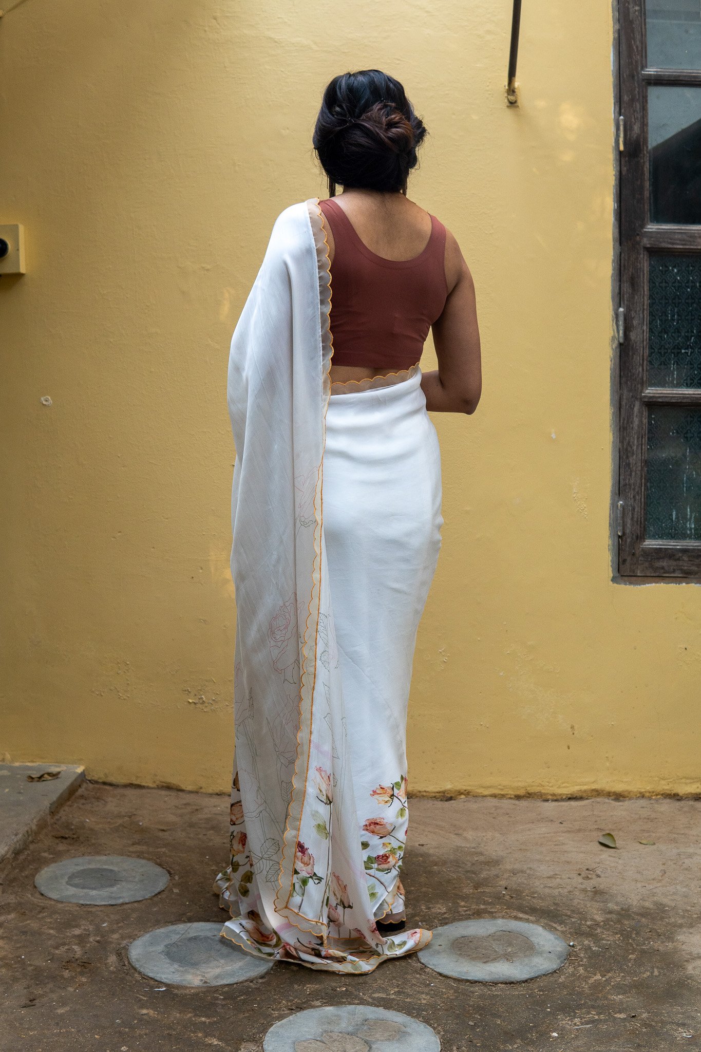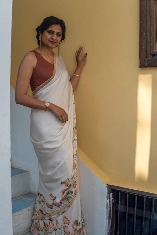 Inspired by the quiet grace of roses, this saree blends subtle hues with their classic elegance. A perfect balance of nostalgia and sophistication, a saree to feel it from within.