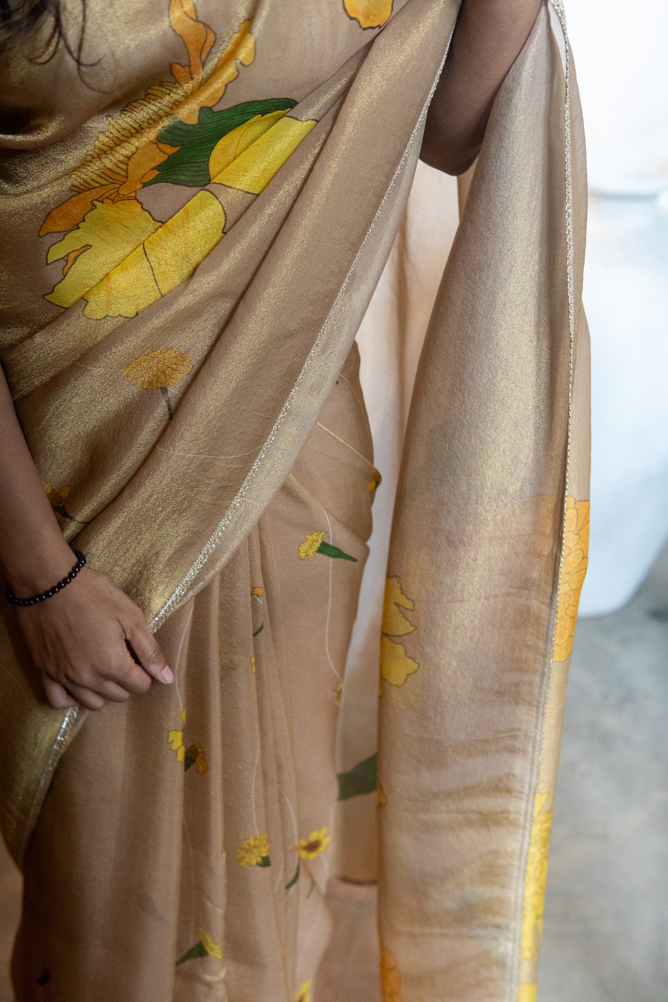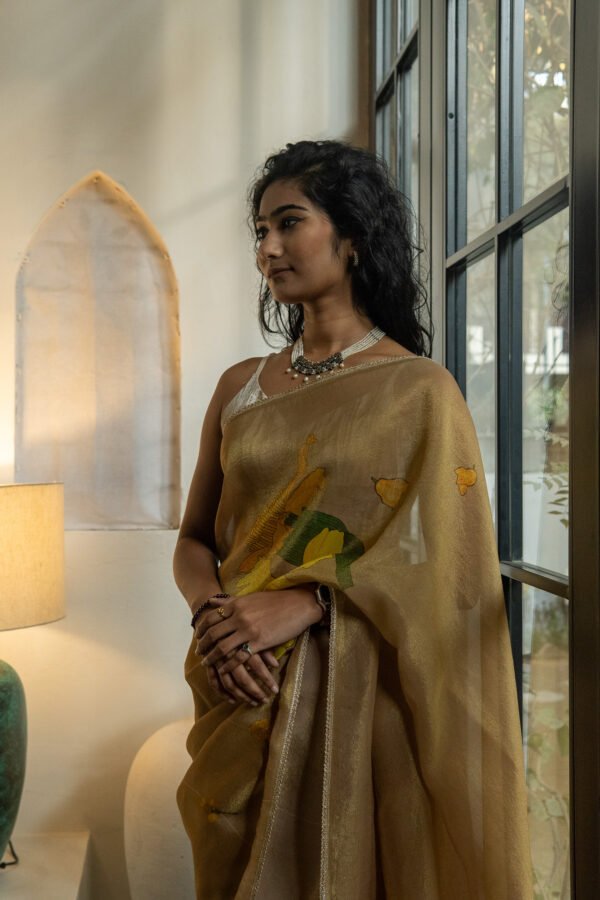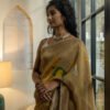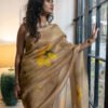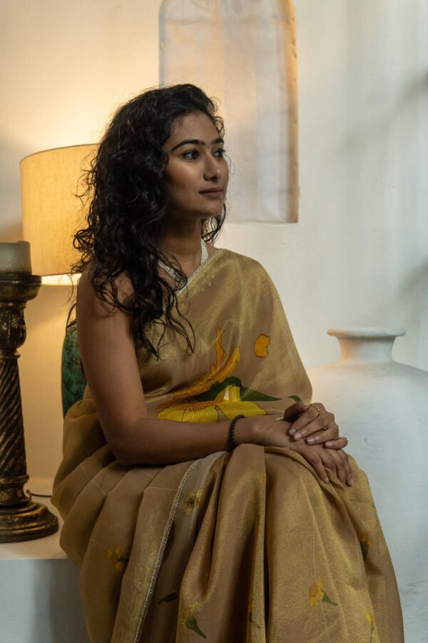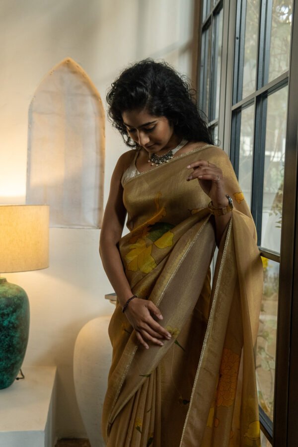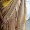 Strings of marigold flowers trail gracefully across the saree, symbolising joy and auspicious moments. Each motif mirrors the happiness and radiance of genda phool in full blossom. A luminous, luxurious drape to feel special, festive and for celebrations.