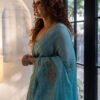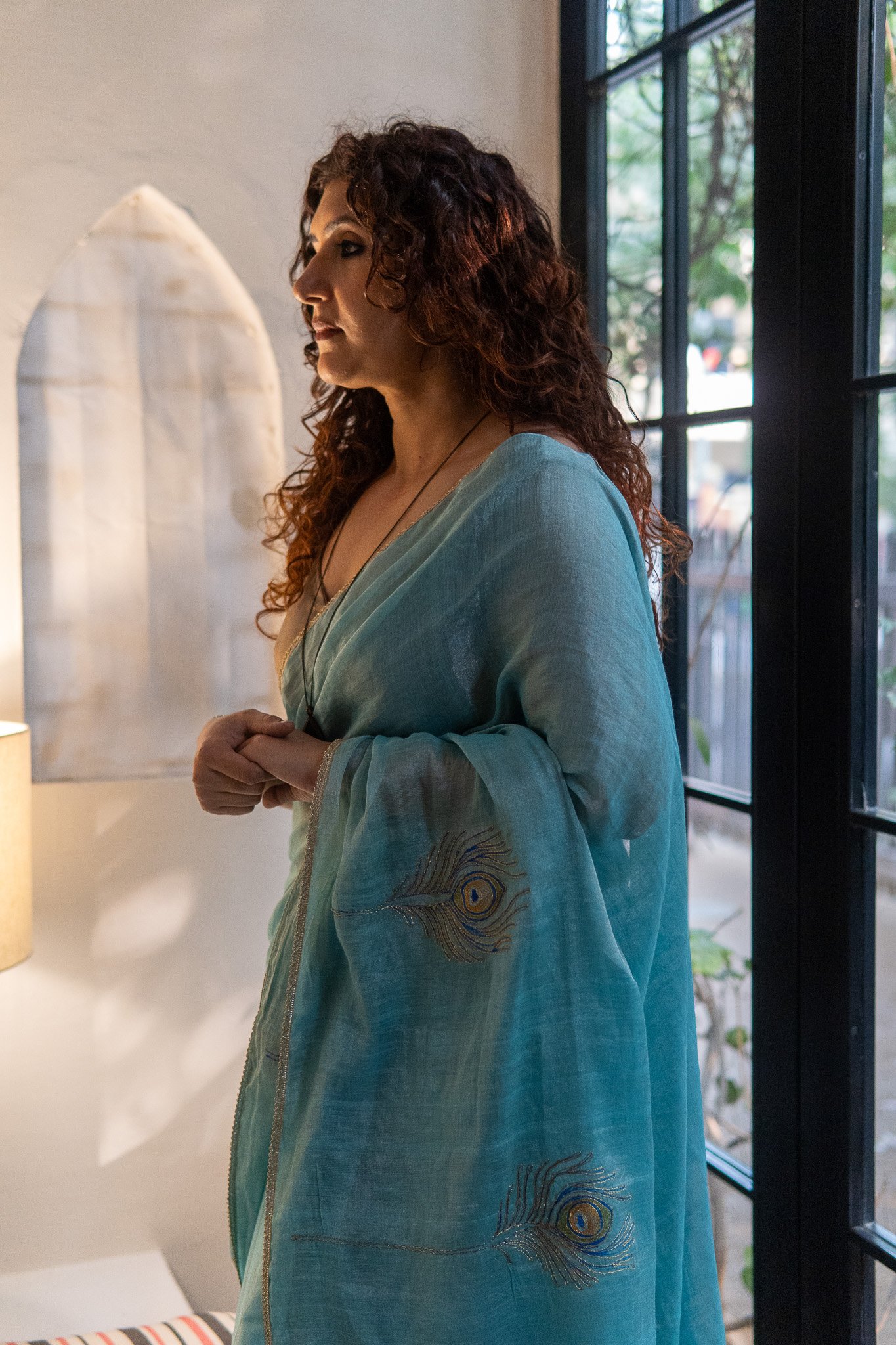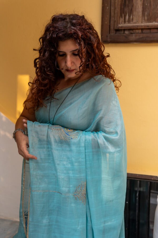 Peacock feathers embroidered on luminous tissue create a soft, airy feel of elegance. Very subtle, regal statement for any special occasion. A saree which says, ‘less is more’.