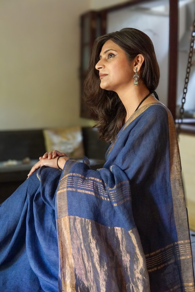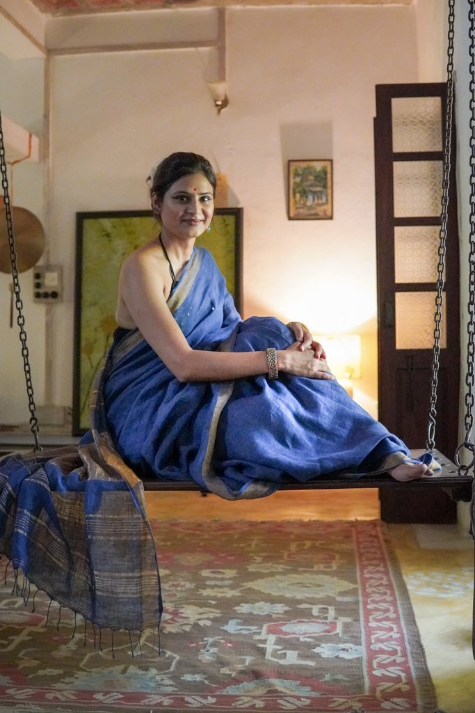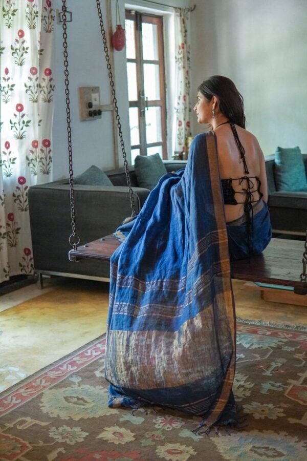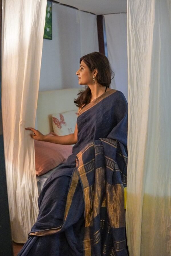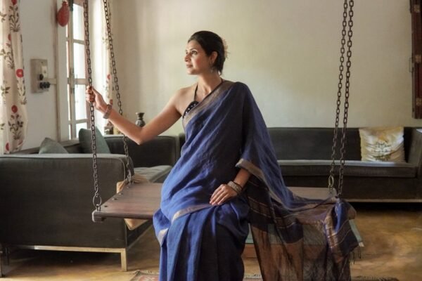Neel is a deep blue plain linen saree with subtle Zari borders. The versatility of the saree makes it appealing for a traditional look or a very contemporary representation. It can be worn in versatile styles for special occasions or a casual day.
