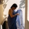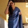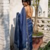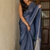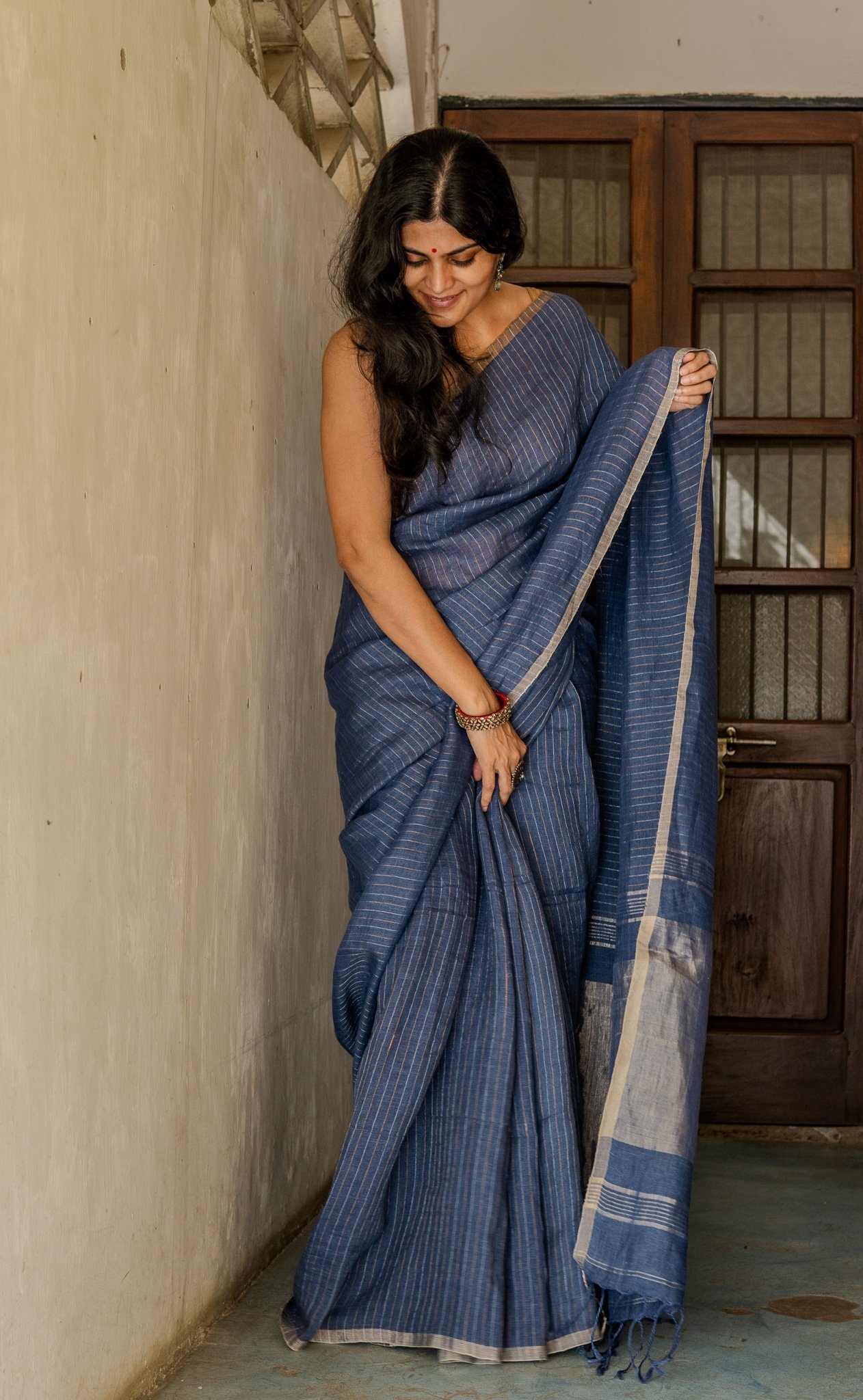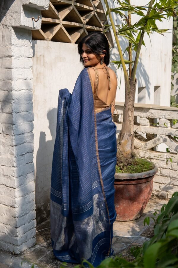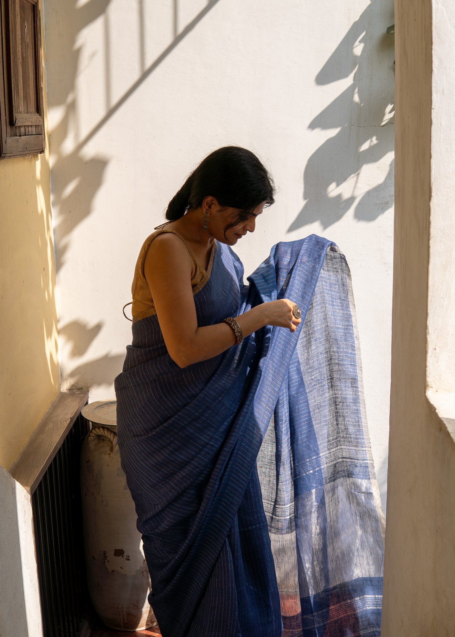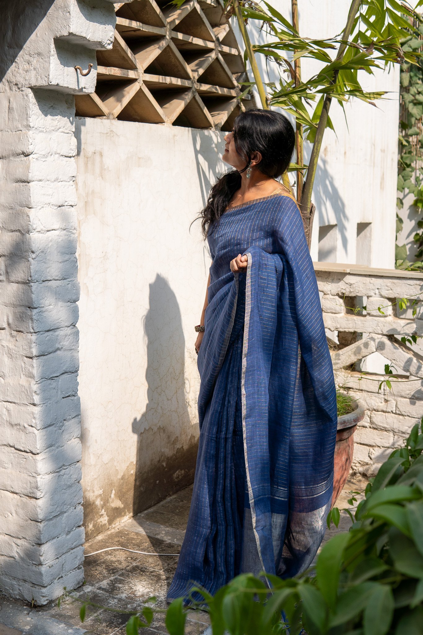 Choose an anchal of gold or of silver with stipes of both gold and silver highlighting this elegant blue linen saree. Drape in elegance of traditional hues with a contemporary feel.
