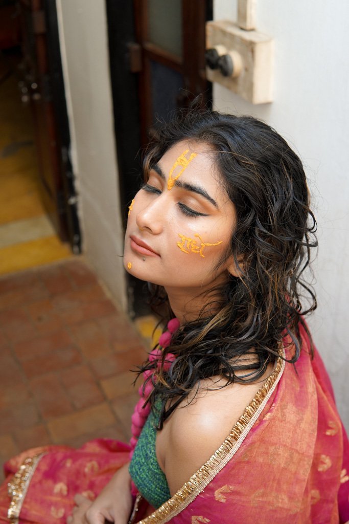 Deep colours of the Vaijantimala, the gulal smeared on her face and the reds adorning her palms and feet have been complimented with this saree.