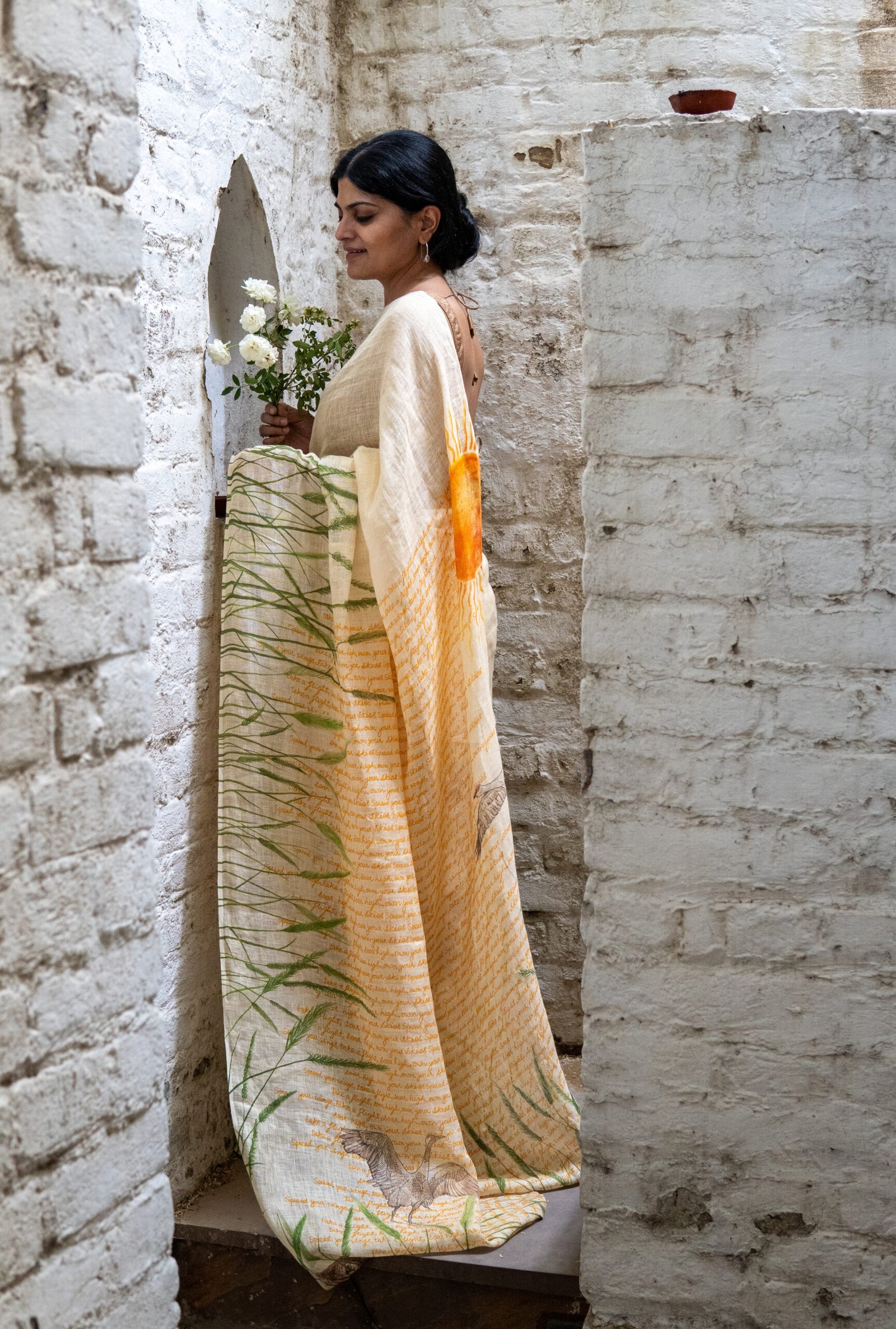 This saree is about the women and their aspirations. Delicate colours show renderings of elegant, beautiful cranes in different stages of a flight.