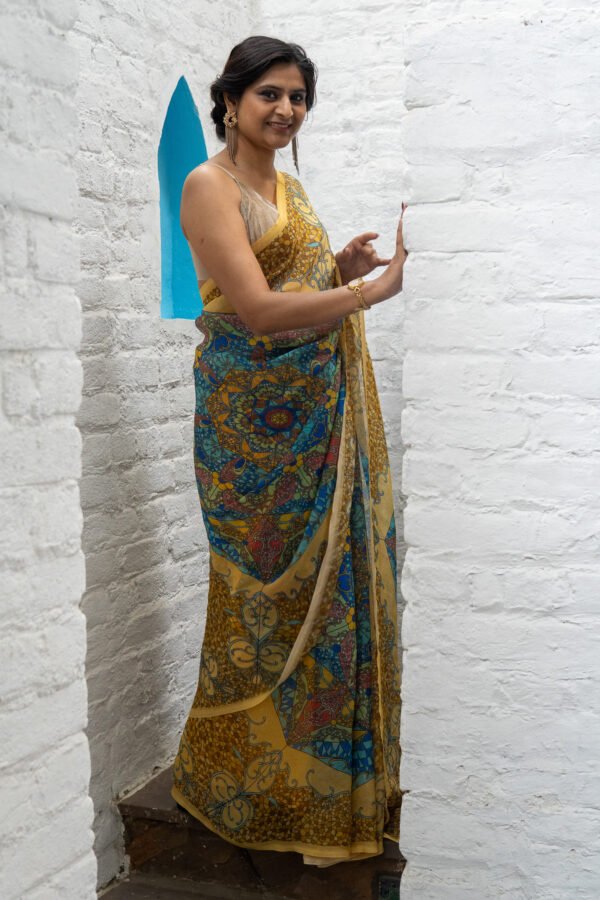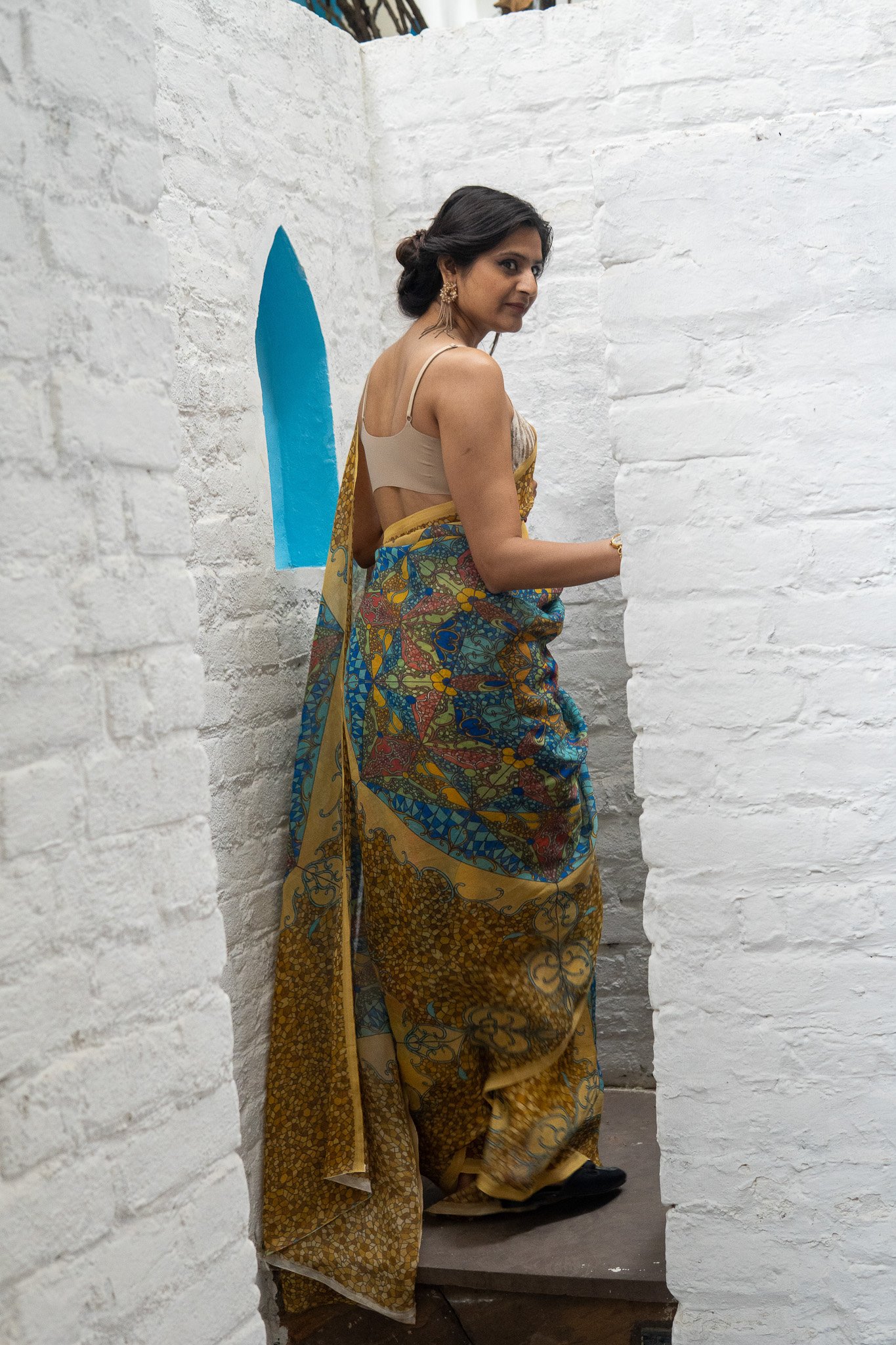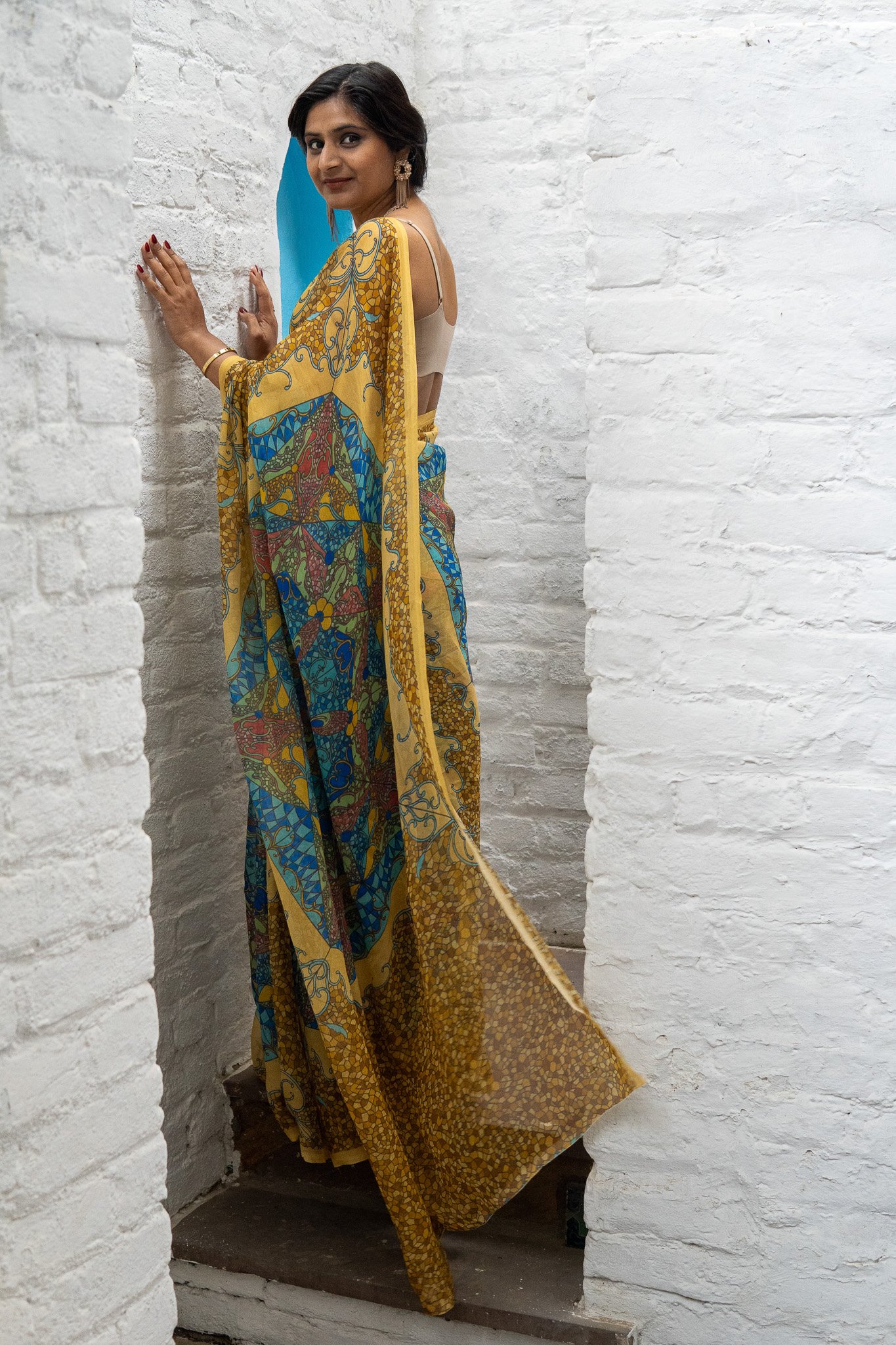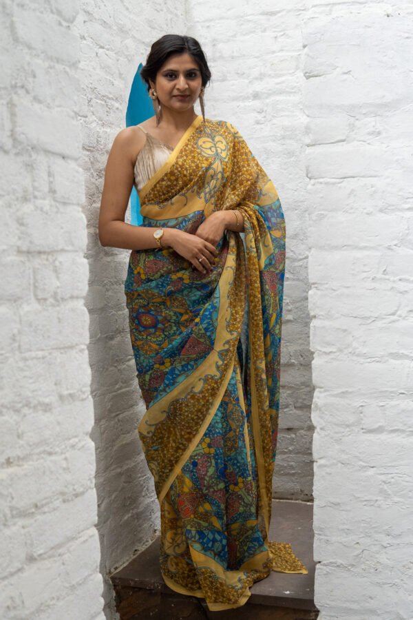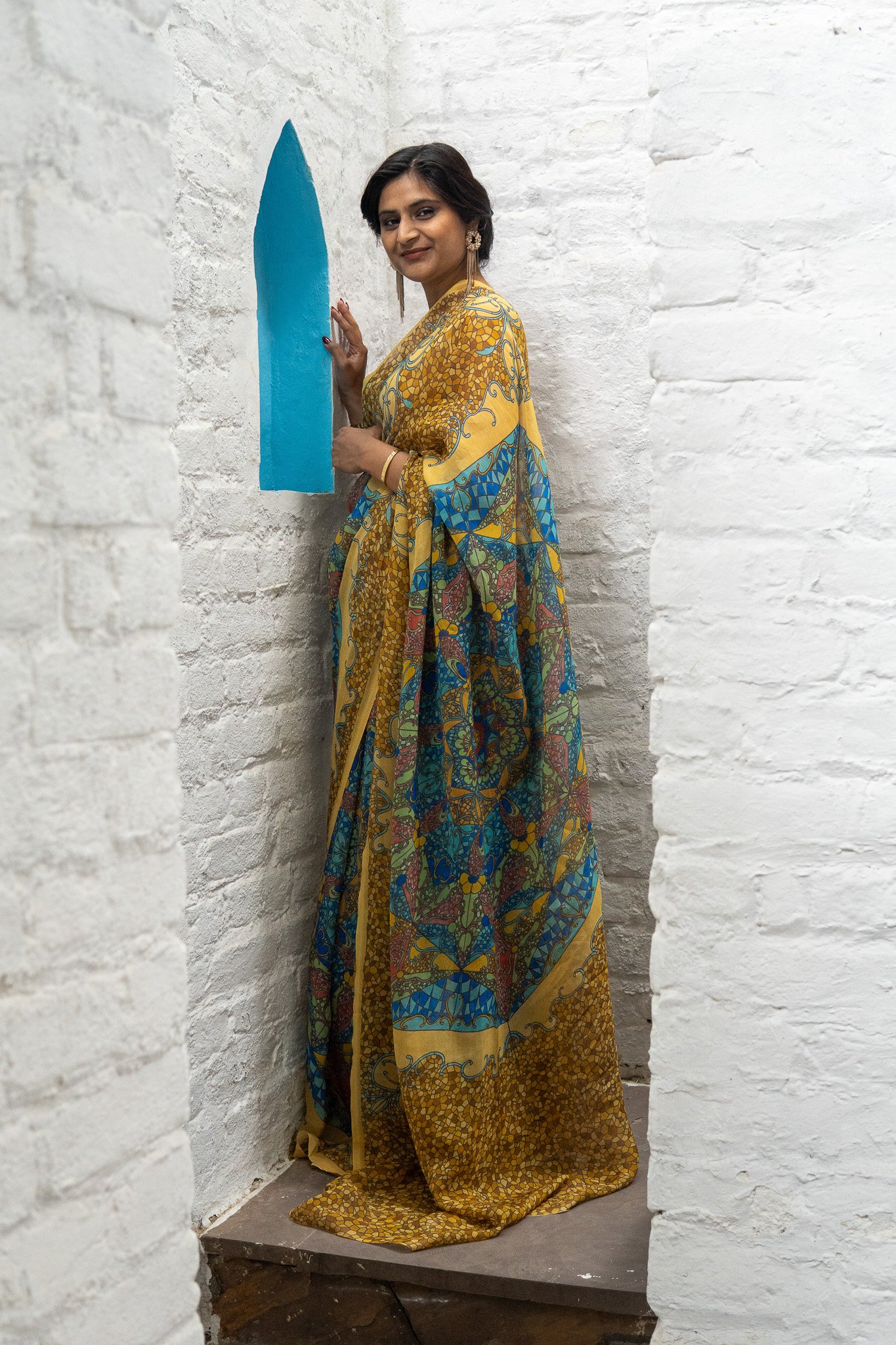 Inspired by luminous stained-glass windows, this saree showcases bold colours and intricate patterns. A vibrant statement piece crafted for those who love art in every detail.