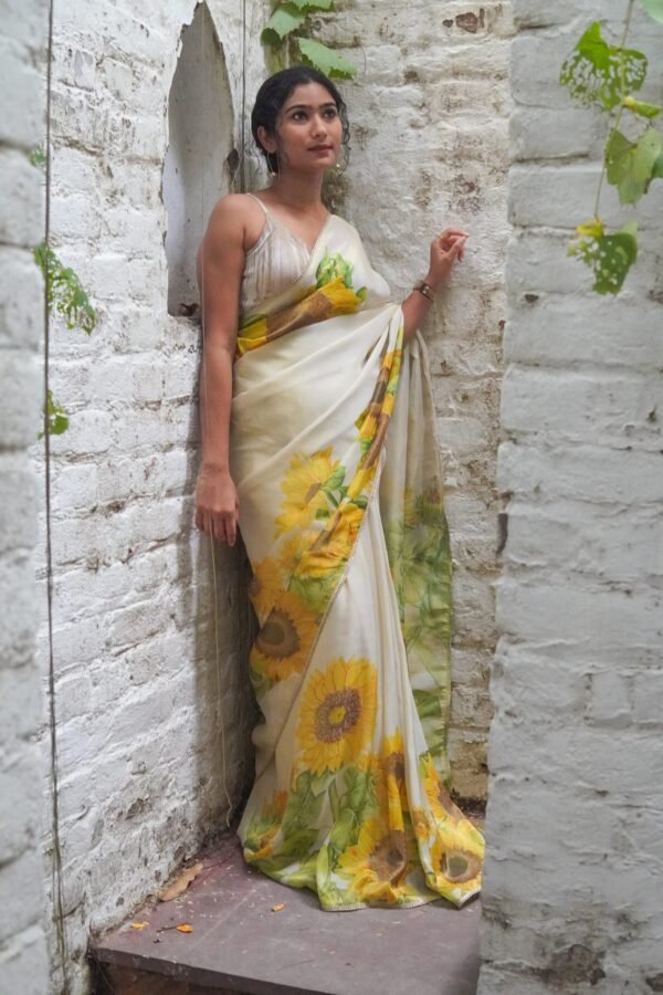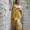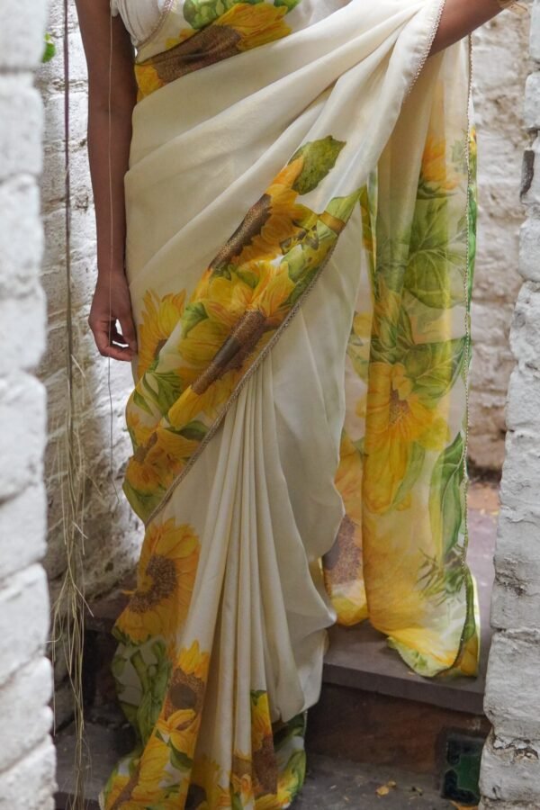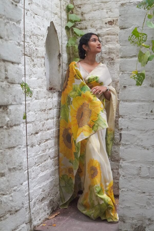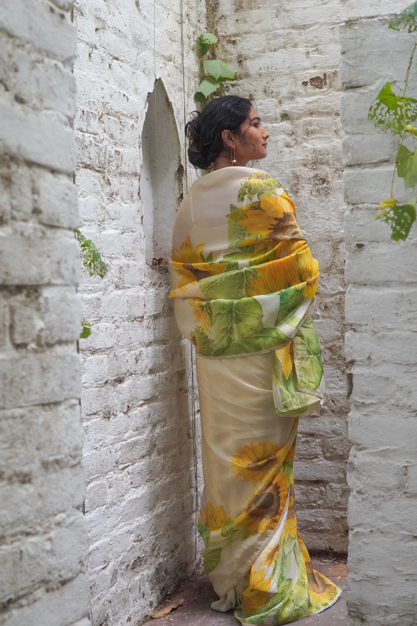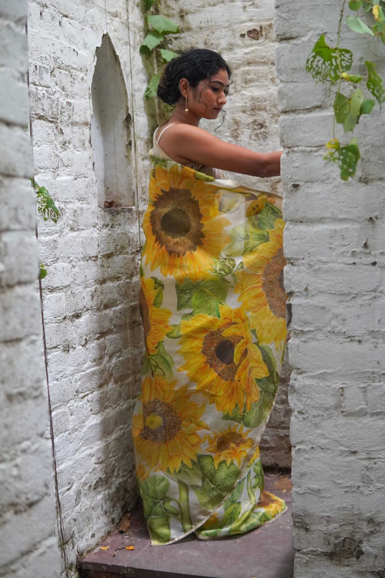 Sunflower reminds us of our passion for light.  The Sunflowers blooming on this subtle saree tell us to look up and bloom. Be it blooms or people, sunshine brings happiness and blooming. Be a bearers of light, be your own sunshine !